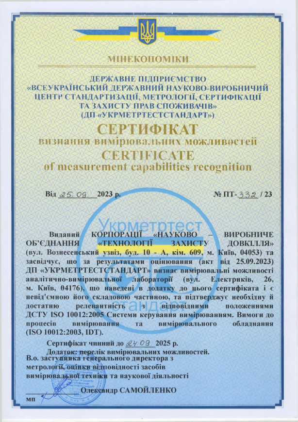 Матеріальна база нашої екологічної лабораторії забезпечить виконання наступних сертифікованих послуг: